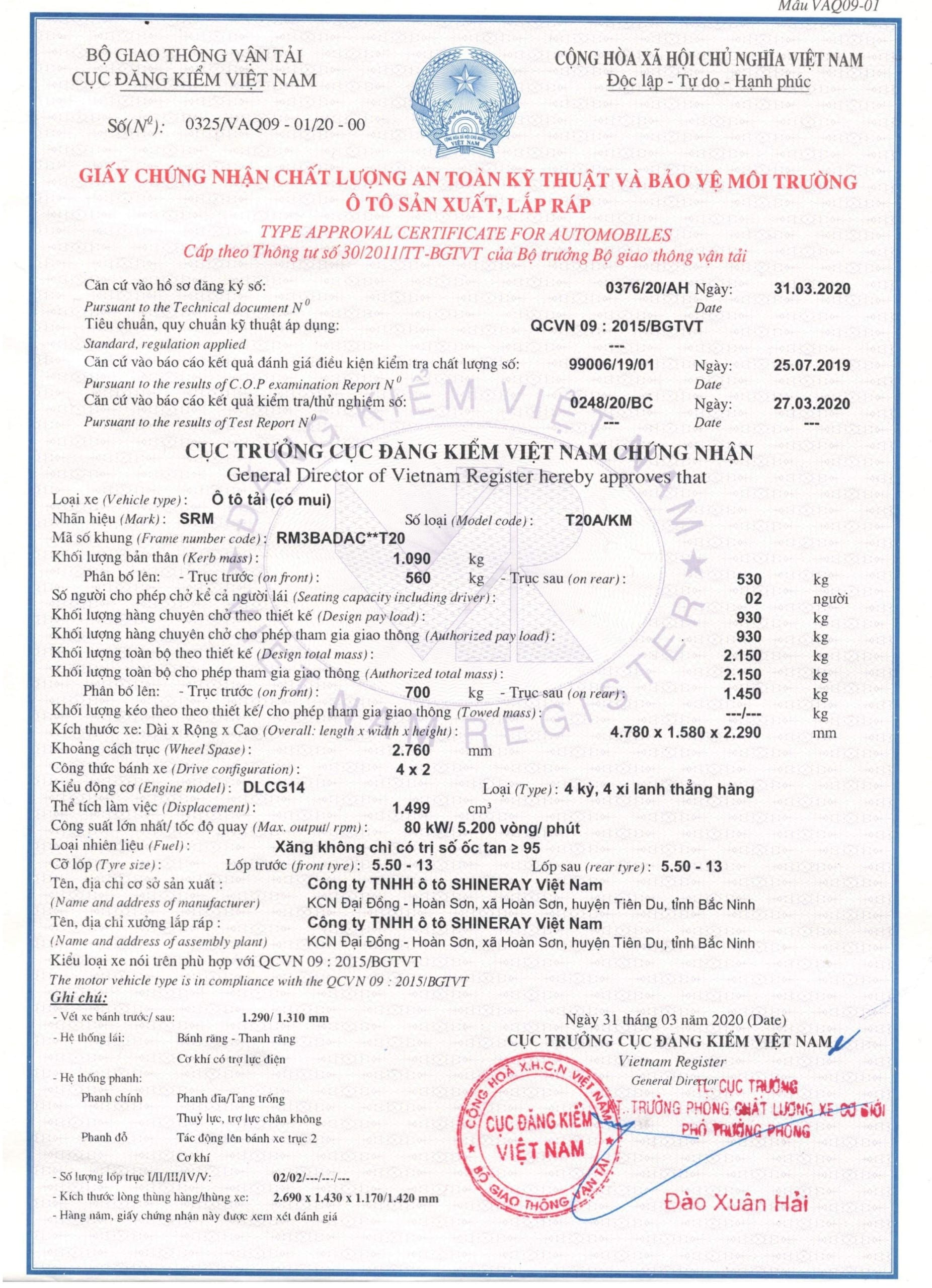 THÔNG SỐ KỸ THUẬT XE TẢI SRM T20 THÙNG MUI BẠT
